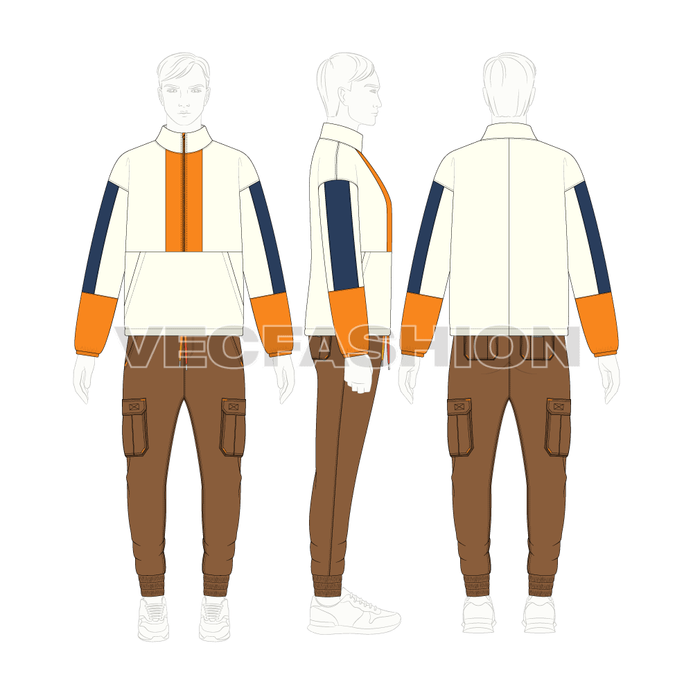 An illustrator flat sketch of Men Oversized Polar Fleece Pullover. It has a mock neck with a zipper on the front. There are panels all over the body and sleeve designs with pockets on the sides.